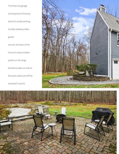 The three car garage and expansive driveway allow for ample parking. A pretty walkway takes guests around, the back of the house to enjoy outdoor parties on the large bluestone patio as well as the paver patio just off the screened in porch.