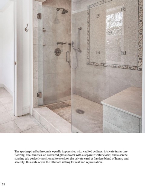 The spa-inspired bathroom is equally impressive, with vaulted ceilings, intricate travertine