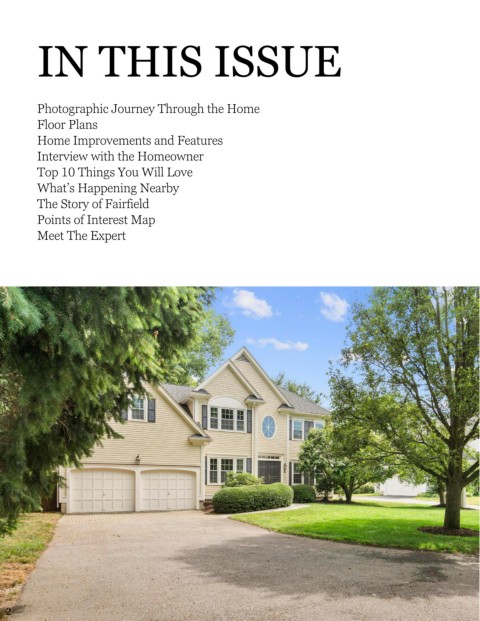IN THIS ISSUE Photographic Journey Through the Home Floor Plans Home Improvements and Features Interview with the Homeowner Top 10 Things You Will Love What’s Happening Nearby The Story of Fairfield Points of Interest Map Meet The Expert 2