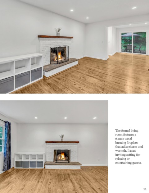 The formal living room features a classic wood burning fireplace that adds charm and warmth. It’s an inviting setting for relaxing or entertaining guests. 11
