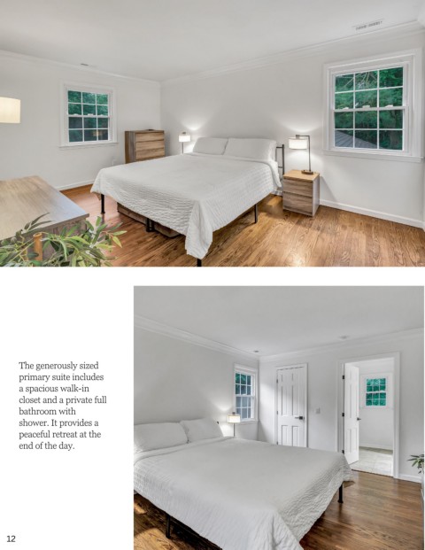 The generously sized primary suite includes a spacious walk-in closet and a private full bathroom with shower. It provides a peaceful retreat at the end of the day. 12
