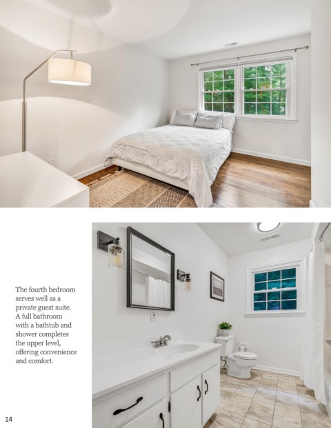 The fourth bedroom serves well as a private guest suite. A full bathroom with a bathtub and shower completes the upper level, offering convenience and comfort. 14