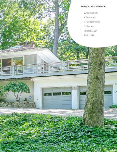 4 BRUCE LANE, WESTPORT • 2,700 square ft. • 4 Bedrooms • 3 Full Bathrooms • 1.15 Acres • Taxes: $11,064 • Built: 1958