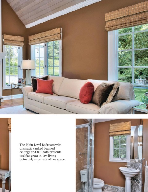 The Main Level Bedroom with dramatic vaulted beamed ceilings and full Bath presents itself as great in-law living potential; or private offi ce space. 7