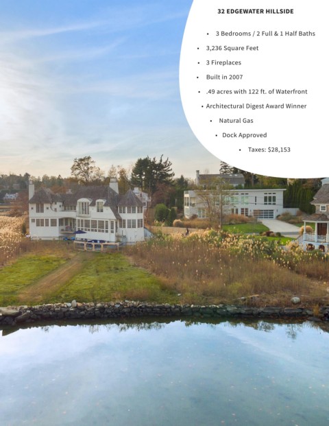 32 EDGEWATER HILLSIDE • 3 Bedrooms / 2 Full & 1 Half Baths • 3,236 Square Feet • 3 Fireplaces • Built in 2007 • .49 acres with 122 ft. of Waterfront • Architectural Digest Award Winner • Natural Gas • Dock Approved • Taxes: $28,153