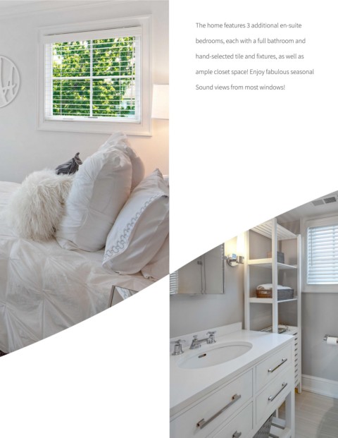 The home features 3 additional en-suite bedrooms, each with a full bathroom and hand-selected tile and fixtures, as well as ample closet space! Enjoy fabulous seasonal Sound views from most windows!