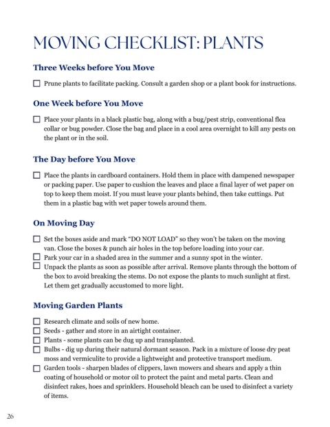 Prune plants to facilitate packing. Consult a garden shop or a plant book for instructions.