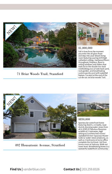 CHECK OUT OUR NEW LISTINGS AND PRICE REDUCTIONS!!! Find Us | vanderblue.com Contact Us | 203.259.8326
