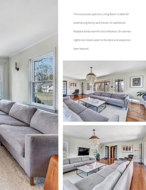 The luxuriously spacious Living Room is ideal for entertaining family and friends. An additional fireplace lends warmth and ambiance. On warmer nights twin doors open to the deck and expansive lawn beyond.