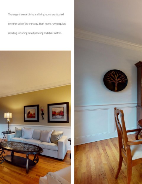 The elegant formal dining and living rooms are situated on either side of the entryway. Both rooms have exquisite detailing, including raised paneling and chair rail trim.