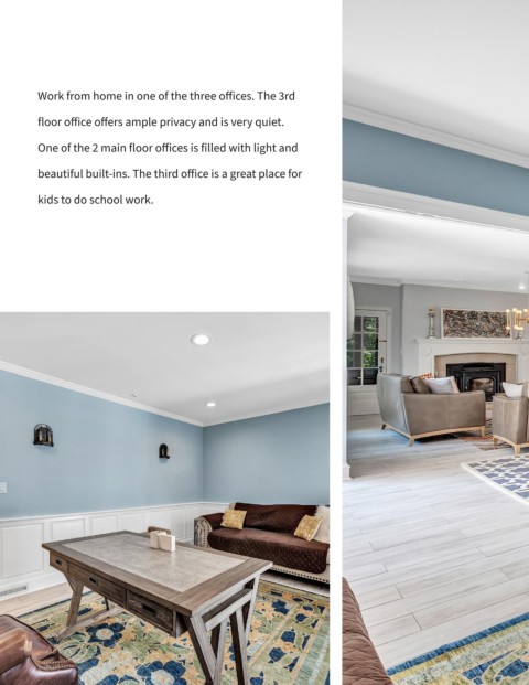 Work from home in one of the three offices. The 3rd floor office offers ample privacy and is very quiet. One of the 2 main floor offices is filled with light and beautiful built-ins. The third office is a great place for kids to do school work.