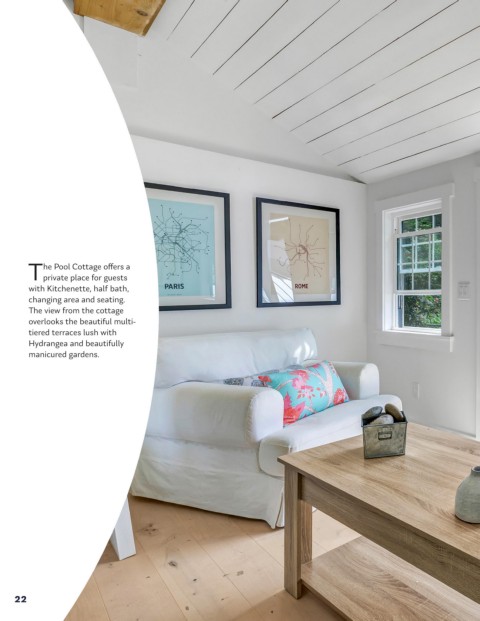 he Pool Cottage o ers a Tprivate place for guests with Kitchenette, half bath, changing area and seating. The view from the cottage overlooks the beautiful multi- tiered terraces lush with Hydrangea and beautifully manicured gardens. 22