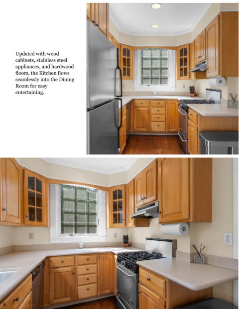 Updated with wood cabinets, stainless steel appliances, and hardwood floors, the Kitchen flows seamlessly into the Dining Room for easy entertaining. 6