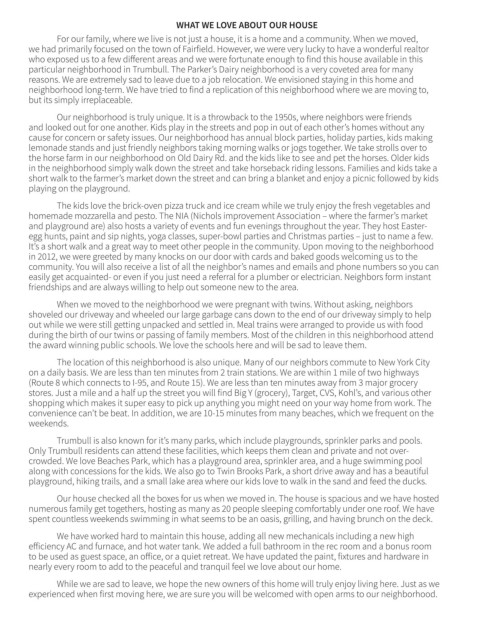 experienced when first moving here, we are sure you will be welcomed with open arms to our neighborhood.