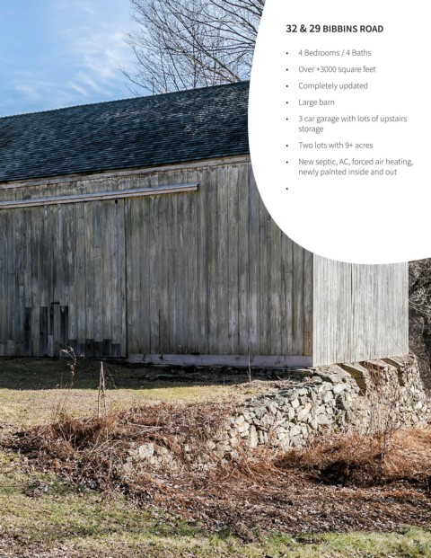 32 & 29 BIBBINS ROAD • 4 Bedrooms / 4 Baths • Over +3000 square feet • Completely updated • Large barn • 3 car garage with lots of upstairs storage • Two lots with 9+ acres • New septic, AC, forced air heating, newly painted inside and out •