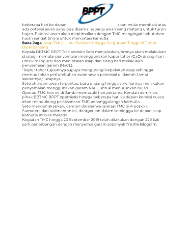 Kegiatan TMC hingga 20 September 2019 telah dilakukan dengan 220 kali sorti penerbangan dengan menyemai garam sebanyak 176.016 kilogram.