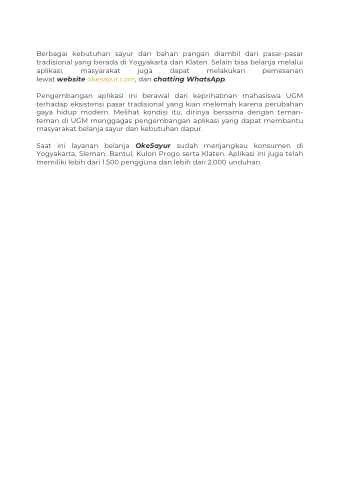 Saat ini layanan belanja OkeSayur sudah menjangkau konsumen di Yogyakarta, Sleman, Bantul, Kulon Progo serta Klaten. Aplikasi ini juga telah memiliki lebih dari 1.500 pengguna dan lebih dari 2.000 unduhan.