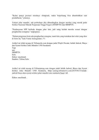 Artikel ini telah tayang di Tribunjateng.com dengan judul Inilah Jadwal, Biaya dan Syarat Seleksi Jalur Mandiri UNS Surakarta, https://jateng.tribunnews.com/2019/06/15/inilah- jadwal-biaya-dan-syarat-seleksi-jalur-mandiri-uns-surakarta?page=all.