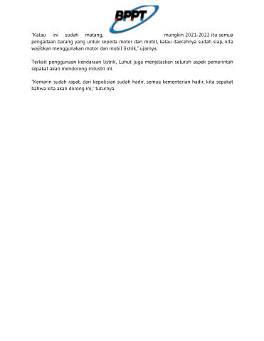 "Kalau ini sudah matang, mungkin 2021-2022 itu semua pengadaan barang yang untuk sepeda motor dan mobil, kalau daerahnya sudah siap, kita wajibkan menggunakan motor dan mobil listrik," ujarnya.
