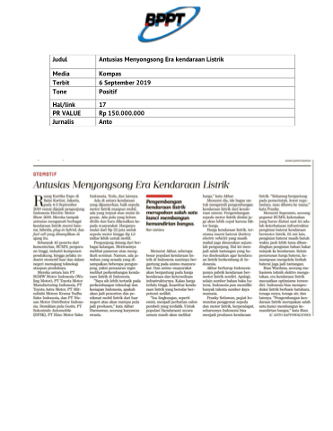 Judul Antusias Menyongsong Era kendaraan Listrik Media Kompas Terbit 6 September 2019 Tone Positif Hal/link 17 PR VALUE Rp 150.000.000 Jurnalis Anto