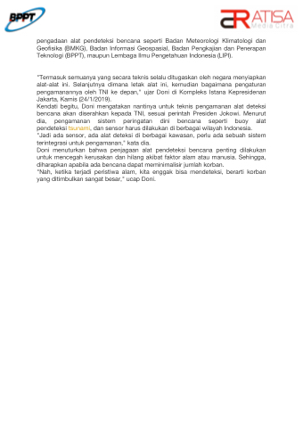 pengadaan alat pendeteksi bencana seperti Badan Meteorologi Klimatologi dan Geofisika (BMKG), Badan Informasi Geospasial, Badan Pengkajian dan Penerapan Teknologi (BPPT), maupun Lembaga Ilmu Pengetahuan Indonesia (LIPI).