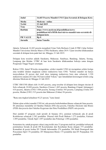 Jakarta: Sebanyak 16.683 peserta mengikuti Ujian Tulis Berbasis Cetak (UTBC) Jalur Seleksi Mandiri Universitas Sebelas Maret (UNS) Surakarta, tahun 2019. Ujian tersebut dilaksanakan serentak di delapan kota pada hari ini, Minggu, 21 Juli 2019.