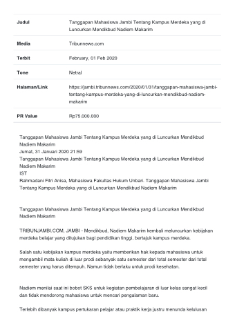 Halaman/Link https://jambi.tribunnews.com/2020/01/31/tanggapan-mahasiswa-jambi- tentang-kampus-merdeka-yang-di-luncurkan-mendikbud-nadiem-