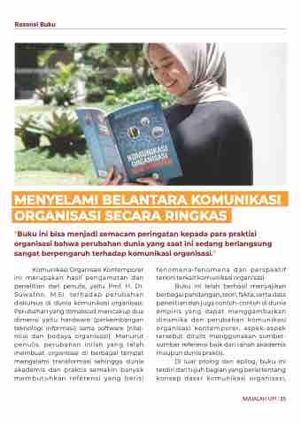 Buku ini telah berhasil menyajikan berbagai pandangan, teori, fakta, serta data penelitian dan juga contoh-contoh di dunia empiris yang dapat menggambarkan dinamika dan perubahan komunikasi organisasi kontemporer, aspek-aspek tersebut ditulis menggunakan sumber- sumber referensi baik dari ranah akademis maupun dunia praktis.