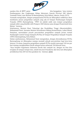 saudara kita di BPPT patut kita banggakan," kata Asisten Pembangunan dan Lingkungan Hidup Sekretaris Daerah Provinsi DKI Jakarta Yusmada Faisal, saat ditemui di Bantargebang, Kota Bekasi, Jakarta, Senin (25/3). Yusmada mengatakan, dengan pengoperasian PLTSa ini diharapkan sedikitnya akan membantu proses pengolahan sampah yang ada di Tempat Pembuangan Sampah Terpadu (TPST) Bantargebang. "TPST ini adalah salah satu tempat pengolahan sampah akhir yang dimiliki oleh Pemprov DKI bekerja sama dengan Pemerintah Kota Bekasi," katanya.