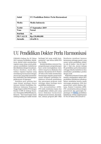 Judul UU Pendidikan Dokter Perlu Harmonisasi Media Media Indonesia Terbit 17 September 2019 Tone Netral Hal/link 16 PR VALUE Rp.120,000,000 Jurnalis (Sru/H-1)