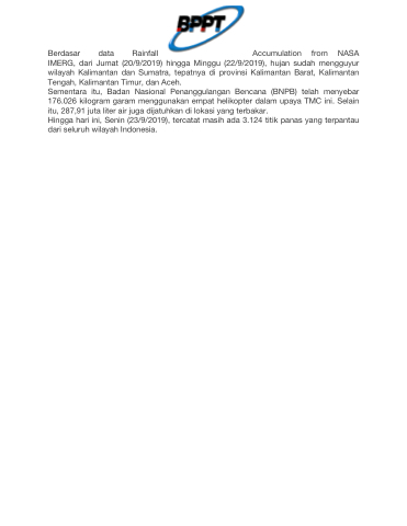 Berdasar data Rainfall Accumulation from NASA IMERG, dari Jumat (20/9/2019) hingga Minggu (22/9/2019), hujan sudah mengguyur wilayah Kalimantan dan Sumatra, tepatnya di provinsi Kalimantan Barat, Kalimantan Tengah, Kalimantan Timur, dan Aceh.