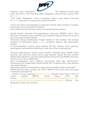 Artikel ini telah tayang di Tribunnews.com dengan judul Hujan Turun Di Jambi Setelah BBTMC Semai Kapur Tohor dan Garam, https://www.tribunnews.com/nasional/2019/09/23/hujan-turun-di- jambi-setelah-bbtmc-semai-kapur-tohor-dan-garam?page=2. Penulis: Fitri Wulandari Editor: Adi Suhendi