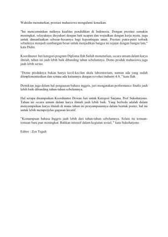 Koordinator Juri kategori program Diploma Ilah Sailah menuturkan, secara umum dalam karya ilmiah, tahun ini jauh lebih baik dibanding tahun sebelumnya. Demo produk mahasiswa juga jauh lebih serius.