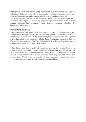 menciptakan riset dan inovasi yang bermanfaat bagi masyarakat yang saat ini didominasi kalangan milenial. Ia mengatakan, kalangan milenial nanti akan menghadapi persaingan pekerjaan yang lebih ketat dibandingkan saat ini.