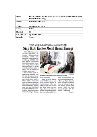 Judul TIGA MOBIL KARYA MAHASISWA UMS Siap Ikuti Kontes Mobil Hemat Energi Media Kedaulatan Rakyat Terbit 18 September 2019 Tone Netral Hal/link 10 PR VALUE Rp.81.000.000 Jurnalis Qom-c