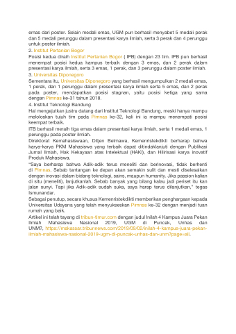 Artikel ini telah tayang di tribun-timur.com dengan judul Inilah 4 Kampus Juara Pekan Ilmiah Mahasiswa Nasional 2019, UGM di Puncak, Unhas dan UNM?, https://makassar.tribunnews.com/2019/09/02/inilah-4-kampus-juara-pekan- ilmiah-mahasiswa-nasional-2019-ugm-di-puncak-unhas-dan-unm?page=all.
