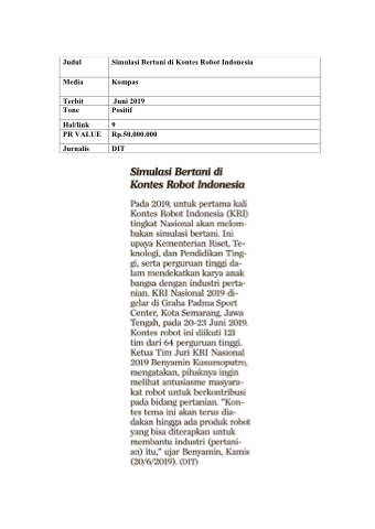 Judul Simulasi Bertani di Kontes Robot Indonesia Media Kompas Terbit Juni 2019 Tone Positif Hal/link 9 PR VALUE Rp.50,000.000 Jurnalis DIT