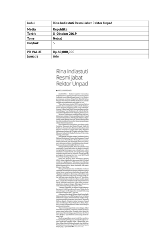 Judul Rina Indiastuti Resmi Jabat Rektor Unpad Media Republika Terbit 8 Oktober 2019 Tone Netral Hal/link 5 PR VALUE Rp.60,000,000 Jurnalis Arie