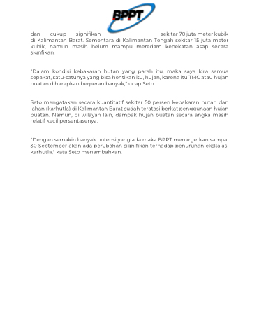 "Dengan semakin banyak potensi yang ada maka BPPT menargetkan sampai 30 September akan ada perubahan signifikan terhadap penurunan ekskalasi karhutla," kata Seto menambahkan.