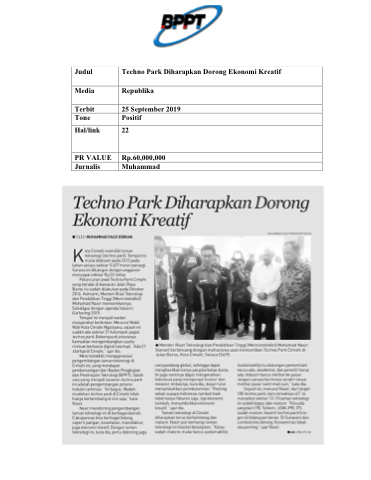 Judul Techno Park Diharapkan Dorong Ekonomi Kreatif Media Republika Terbit 25 September 2019 Tone Positif Hal/link 22 PR VALUE Rp.60,000,000 Jurnalis Muhammad