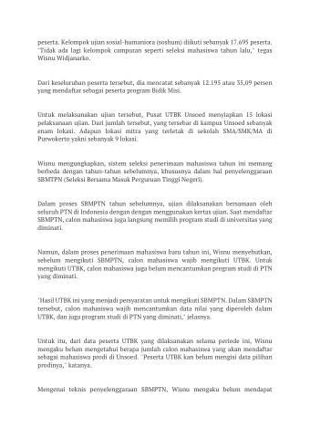 peserta. Kelompok ujian sosial-humaniora (soshum) diikuti sebanyak 17.695 peserta. "Tidak ada lagi kelompok campuran seperti seleksi mahasiswa tahun lalu,'' tegas Wisnu Widjanarko.