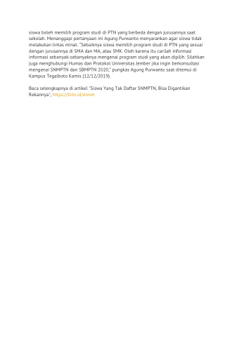 siswa boleh memilih program studi di PTN yang berbeda dengan jurusannya saat sekolah. Menanggapi pertanyaan ini Agung Purwanto menyarankan agar siswa tidak melakukan lintas minat. “Sebaiknya siswa memilih program studi di PTN yang sesuai dengan jurusannya di SMA dan MA, atau SMK. Oleh karena itu carilah informasi informasi sebanyak-sebanyaknya mengenai program studi yang akan dipilih. Silahkan juga menghubungi Humas dan Protokol Universitas Jember jika ingin berkonsultasi mengenai SNMPTN dan SBMPTN 2020,” pungkas Agung Purwanto saat ditemui di Kampus Tegalboto Kamis (12/12/2019).