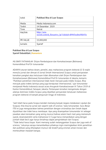 ADANYA aturan bahwa dosen, peneliti, atau mahasiswa program doktoral (S-3) wajib menulis jurnal dan dimuat di Jurnal Ilmiah Internasional Scopus untuk persyaratan kenaikan pangkat atau kelulusan tidak dibenarkan oleh Dirjen Pembelajaran dan Kemahasiswaan (Belmawa) Kemendikbud Prof Dr Ismunandar di Jakarta, kemarin. "Publikasi penelitian internasional tidak mesti merujuk pada indeks Scopus. Bisa merujuk pada indeks lainnya yang juga bereputasi internasional," ujar Ismunandar menjawab Media Indonesia seusai acara Anugerah Kemahasiswaan III Tahun 2019 di Kantor Kemendikbud, Senayan, Jakarta. Pertanyaan tersebut mengemuka dengan adanya dominasi indeks Scopus yang dijadikan persyaratan kelulusan mahasiswa program doktoral di banyak perguruan tinggi di Indonesia.