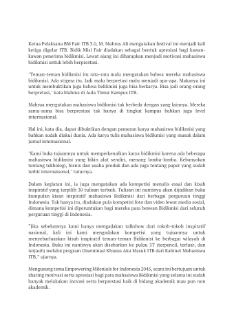 "Teman-teman bidikmisi itu rata-rata malu mengatakan bahwa mereka mahasiswa bidikmisi. Ada stigma itu. Jadi malu berpretasi malu menjadi apa-apa. Makanya ini untuk membuktikan juga bahwa bidikmisi juga bisa berkarya. Bisa jadi orang-orang berpretasi," kata Mahrus di Aula Timur Kampus ITB.