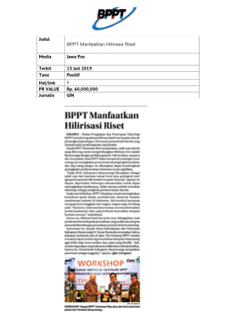 Judul BPPT Manfaatkan Hilirisasi Riset Media Jawa Pos Terbit 13 Juli 2019 Tone Positif Hal/link 6 PR VALUE Rp. 60,000,000 Jurnalis GIN