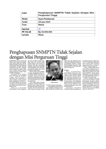 Judul Penghapusan SNMPTN Tidak Sejalan dengan Misi Perguruan Tinggi Media Suara Pembaruan Terbit 28 Juni 2019 Tone Netral Hal/link 18 PR VALUE Rp 50.000.000 Jurnalis Maria