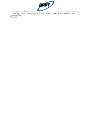 pembangunan berbasis inovasi, innovation driven economy. Sumber daya manusia iptek yang telah dilukis oleh Prof Habibie di masa lalu harus terus ada," jelas Hammam. (gbr/hri)