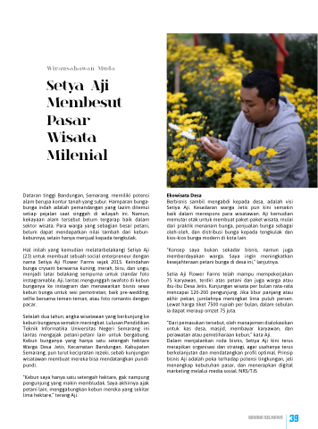 Dataran tinggi Bandungan Semarang memiliki potensi alam berupa kontur tanah yang subur Hamparan bunga- bunga indah adalah pemandangan yang lazim ditemui setiap pejalan saat singgah di wilayah ini Namun kekayaan alam alam tersebut belum tergarap baik dalam sektor wisata Para warga yang sebagian besar petani belum dapat dapat mendapatkan nilai tambah dari kebun- kebunnya selain hanya menjual kepada tengkulak Hal inilah yang kemudian melatarbelakangi Setiya Aji (23) untuk membuat sebuah social enterpreneur dengan nama Setiya Aji Flower Farms sejak 2015 Keindahan bunga crysant berwarna kuning merah biru dan ungu menjadi latar belakang sempurna untuk standar foto instagramable Aji lantas mengunggah swafoto di kebun bunganya ke instagram dan menawarkan bisnis sewa kebun bunga untuk sesi pemotretan baik pre-wedding sel e e e e e e bersama teman-teman atau foto romantis dengan pacar Setelah dua tahun angka wisatawan yang berkunjung ke kebun bunganya semakin meningkat Lulusan Pendidikan Teknik Informatika Universitas Negeri Semarang ini lantas mengajak petani-petani lain untuk bergabung Kebun bunganya yang hanya satu setengah hektare Warga Desa Jetis Kecamatan Bandungan Kabupaten Semarang pun turut kecipratan rezeki sebab kunjungan wisatawan membuat mereka bisa mendatangkan pundi- pundi “Kebun saya hanya satu setengah hektare gak nampung pengunjung yang makin membludak Saya akhirnya ajak petani lain menggabungkan kebun mereka yang sekitar lima hektare ” terang Aji Ekowisata Desa Berbisnis sambil mengabdi kepada desa adalah visi Setiya Aji Kesadaran warga Jetis pun kini semakin baik dalam merespons para wisatawan Aji kemudian memutar otak untuk membuat paket-paket wisata mulai dari praktik menanam bunga bunga penjualan bunga bunga sebagai oleh-oleh dan dan distribusi bunga kepada tengkulak dan dan kios-kios bunga modern di kota lain “Konsep saya bukan sekadar bisnis namun juga memberdayakan warga Saya ingin meningkatkan kesejahteraan petani bunga di desa ini ” lanjutnya Setia Aji Flower Farms telah mampu mempekerjakan 75 karyawan terdiri atas petani dan juga warga atau ibu-ibu Desa Jetis Kunjungan wisata per bulan rata-rata mencapai 120-200 pengunjung Jika libur panjang atau akhir pekan jumlahnya meningkat lima puluh persen Lewat harga tiket 7500 rupiah per bulan bulan dalam sebulan ia dapat meraup omzet 75 juta “Dari pemasukan tersebut oleh manajemen dialokasikan untuk kas desa masjid membayar karyawan dan perawatan atau pemeliharaan kebun ” kata Aji Dalam menjalankan roda bisnis Setiya Aji kini terus merapikan organisasi dan strategi agar usahanya terus berkelanjutan dan mendatangkan pro l l l optimal Prinsip bisnis Aji adalah peka terhadap potensi lingkungan jeli menangkap kebutuhan pasar dan menerapkan digital marketing melalui media sosial NRS/TJS