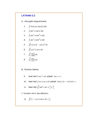 LATIHAN 3.2 A. Hitunglah integral berikut: 1. ∫ 3 2. ∫ 3. ∫ 4. ∫ 3 5. ∫ 6. ∫ 3 5 7. ∫ 3 8. ∫ 3 B. Buktikan bahwa: 9. hasil dari ∫ e adalah . 10. hasil dari ∫ e adalah | | . 11. hasil dari ∫ = 3 C. Tentukan nilai , jika diketahui: 12. ∫ =