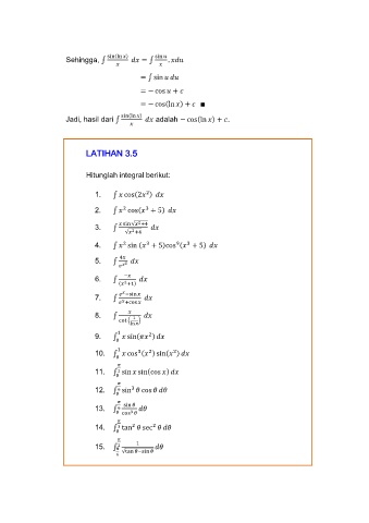 Sehingga, ∫ = ∫ . = ∫ = = Jadi, hasil dari ∫ adalah . LATIHAN 3.5 Hitunglah integral berikut: 1. ∫ 2. ∫ 3. ∫ + + 4. ∫ 9 5. ∫ 6. ∫ + 7. ∫ + 8. ∫ t ( ) ln 9. ∫ 10. ∫ 11. ∫ 12. ∫ 13. ∫ 3 14. ∫ e 3 15. ∫ ta